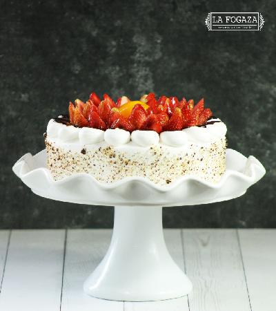 Pan de chocolate bañado en leches, relleno de mermelada de fresa, cubierto de crema batida...