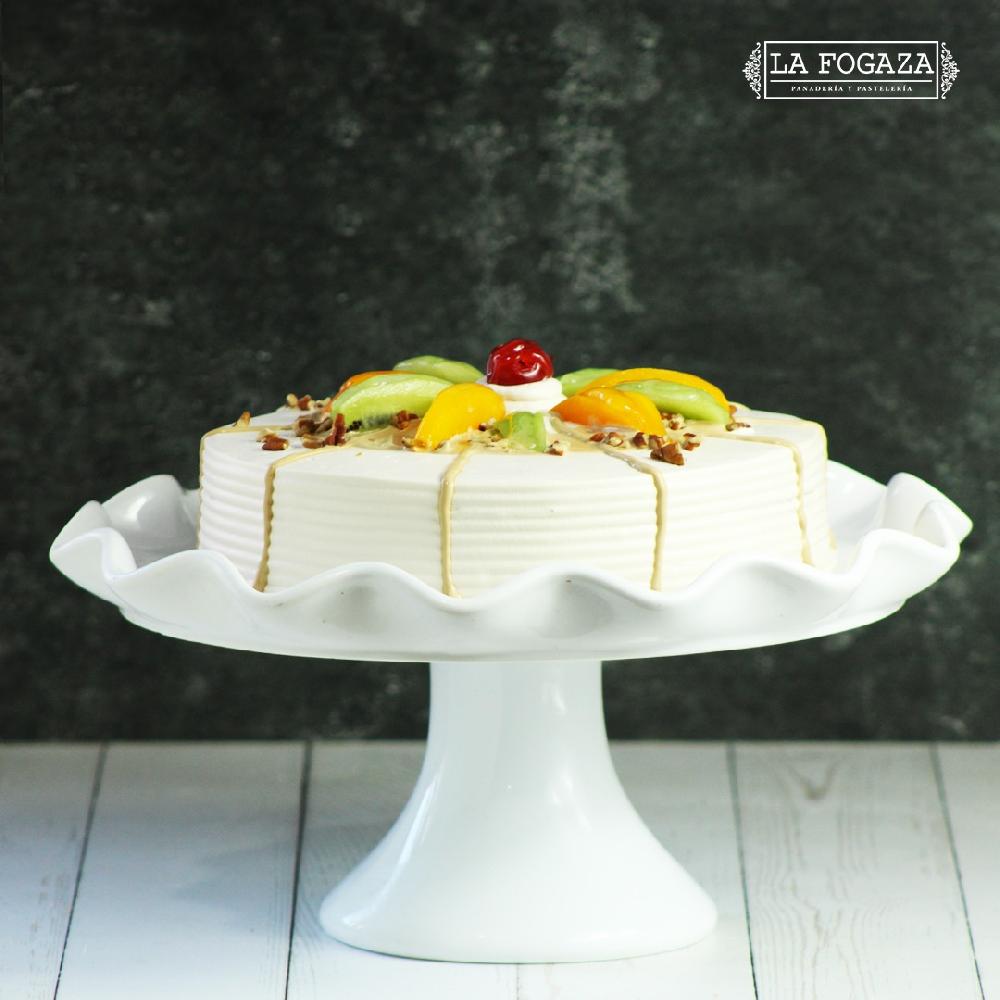 Pan de vainilla relleno de crema batida sabor moka, nuez, bañado en 3 leches y decorado con fruta y crema batida sabor moka. De no haber en existencia, favor de realizar su pedido con 1 día de anticipación.