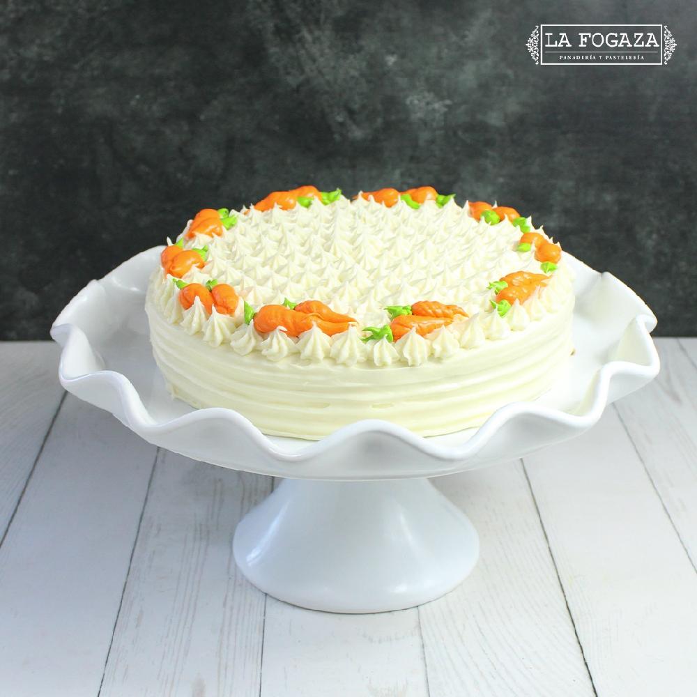 Pan de zanahoria, cubierto de betún de queso crema. De no haber en existencia, este pastel de Línea Premium es necesario solicitarlo con 2 días de anticipación.